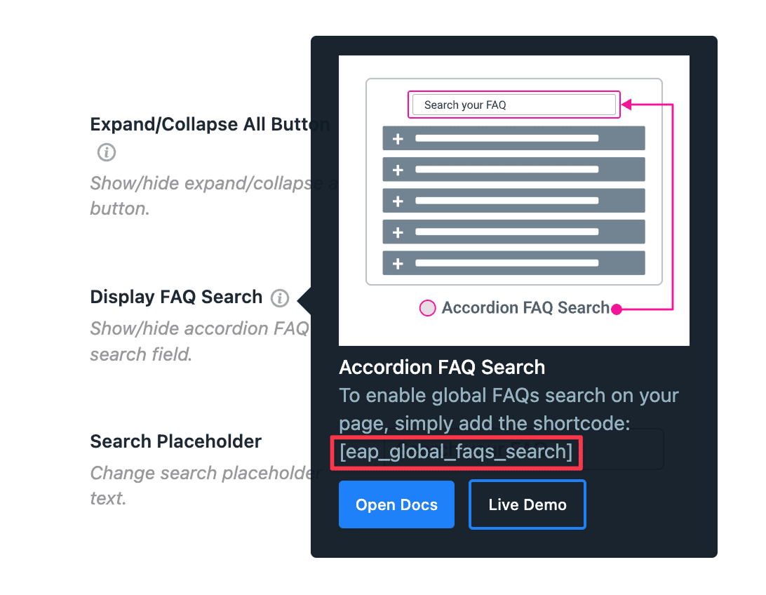 Enabling the Global FAQ Search for your accordions on a page can be done by adding this shortcode [eap_global_faqs_search] on the page where you added the accordions. The shortcode can be found in the (i) button of the Display FAQ Search option under the Accordion Settings tab.