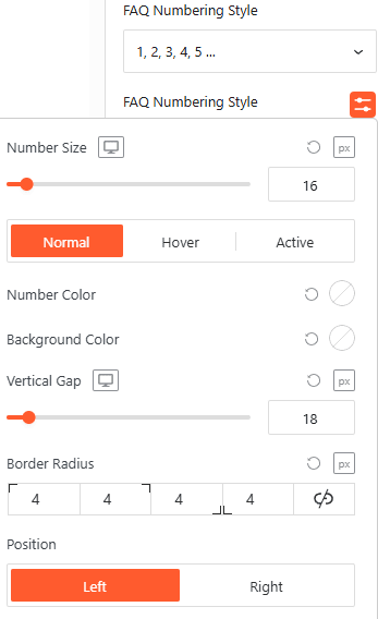 - Style the FAQ Numbering: Set the number size, colors, and choose between Left or Right alignment.