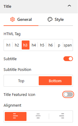 From the Title panel, you can configure the structural tags, alignment, and sub-labels for your accordion headers to improve both SEO and visual hierarchy.