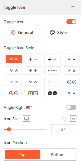 - Toggle Icon Style: Select from various icon pairs, like arrows or plus/minus signs, for open and closed states.