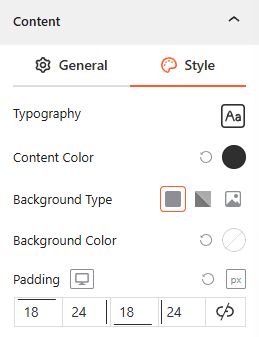 From this panel, you can customize typography, content color, background types & color, and manage internal padding for a clean layout.