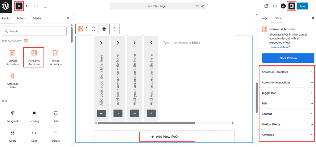 Using the Horizontal Accordion Block, you can showcase FAQs, product details, or text-heavy content in a clean, side-expanding layout. Follow the steps below to add unlimited items and customize the styling as you need.