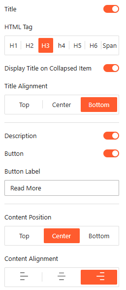 - Title Visibility: Choose whether to Display Title on Collapsed Item to keep headings visible even when the panel is closed.