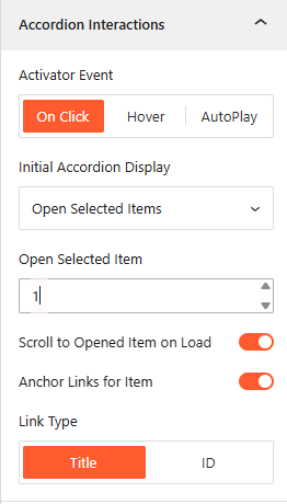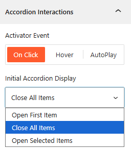 - Activator Event: Choose the trigger to open accordions: On Click, Mouseover, or AutoPlay.