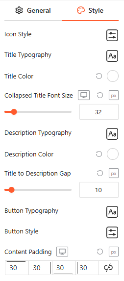 From the Content Style panel, you can customize Icon Style, Title, and Description Typography and Color, Collapsed Title Font Size, Title to Description Gap, Button Typography and Style, and Content Padding.