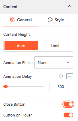 - Content Height: Select Auto for natural expansion or Limit to set a specific maximum height for the content area.