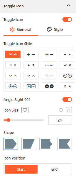 - Toggle Icon Style: Select from various icon pairs, like arrows or plus/minus signs, for open and closed states.