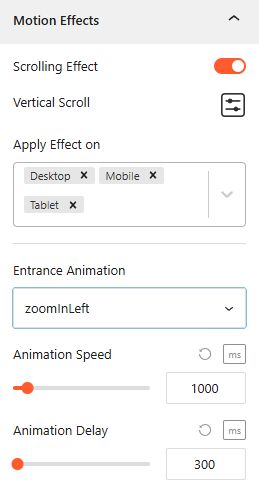 From the Motion Effects panel, you can add animations and interactive movement to your accordion, making the content feel more dynamic as users scroll or interact.