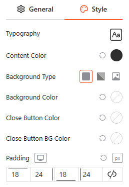 From this panel, you can customize the typography, background types, and colors for the content and close button while managing internal padding for a clean layout.