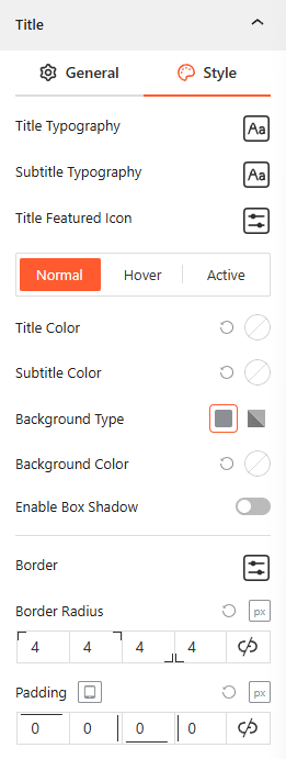 This panel allows you to define typography, box shadows, and background colors for Titles & Sub-Titles in Normal, Hover, and Active states while managing border radius and internal padding.