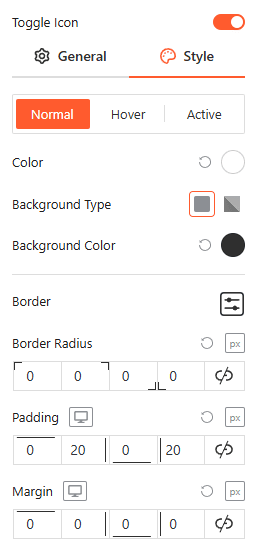Customize the colors, background types, borders, and spacing of your icons for Normal, Hover, and Active states from here.
