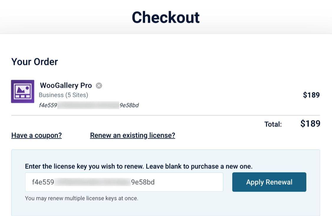 After clicking this renewal button, a checkout page will appear. Here, you will see a notice about “Renew an existing license?” Click on this, enter your existing license key, and click Apply Renewal. Now, choose a payment method and complete the purchase.