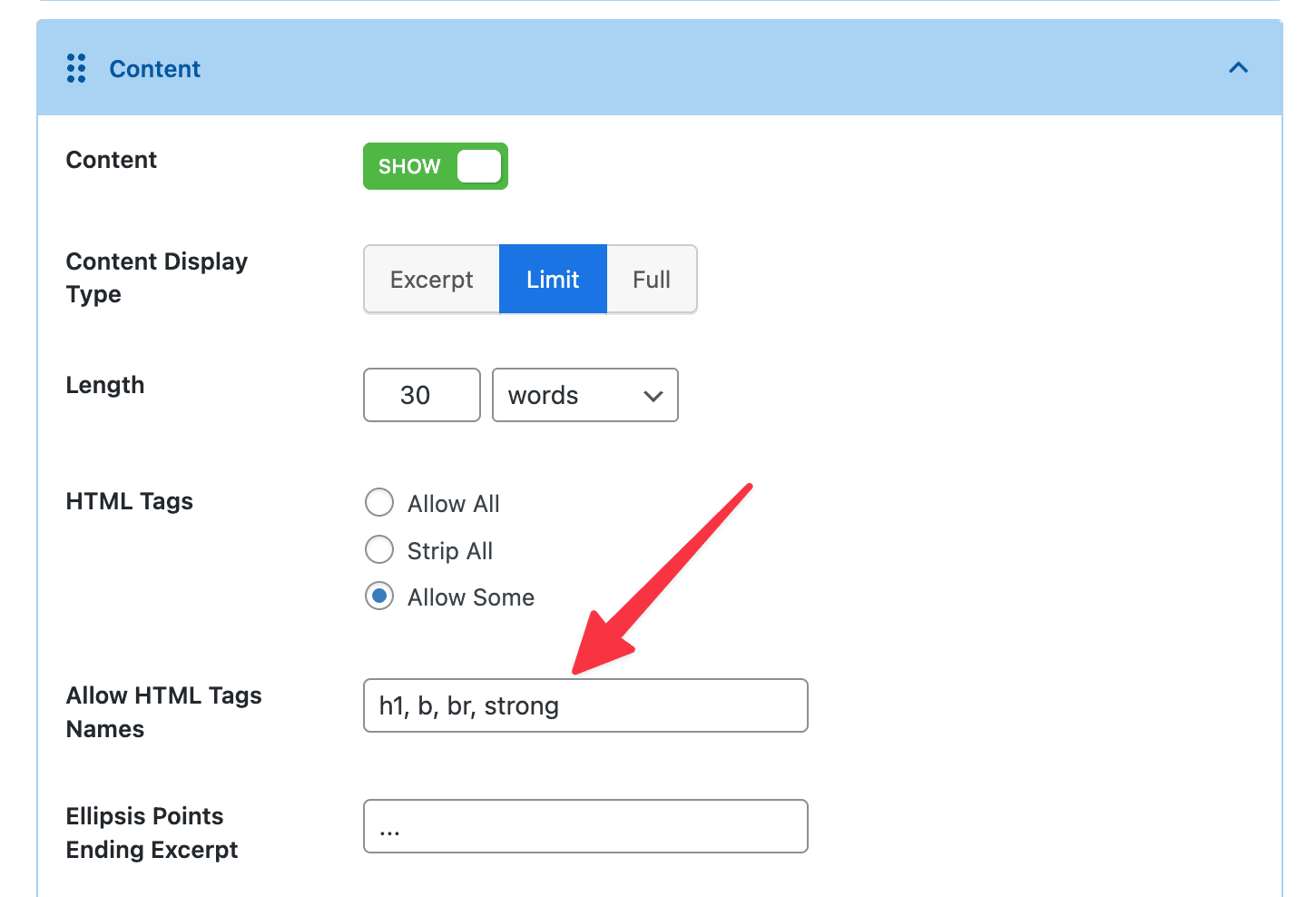 (iii) Words Length: If you select the Content with Limit display type, you will see an option named Words Length to set the content character length.