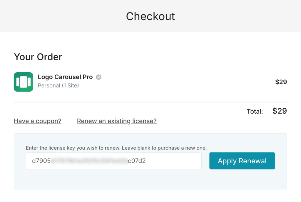 After clicking this renewal button, a checkout page will appear. Here, you will see a notice about “Renew an existing license?” Click on this, enter your existing license key, and click Apply Renewal. Now, choose a payment method and complete the purchase.