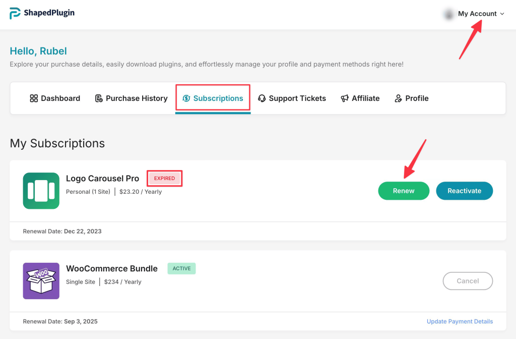 If a license has expired for any of your paid plugins, you will see an expiration notice in your account Dashboard → My Subscriptions → Exipred. To renew the license click the Renew button.