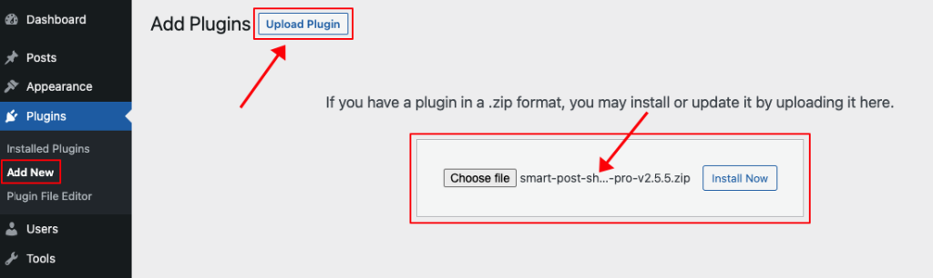 3. Once you click the “Upload Plugin” button, you will get the plugin upload option from your computer. Select the “smart-post-show-pro.zip” file from your computer and click the “Install Now” button.