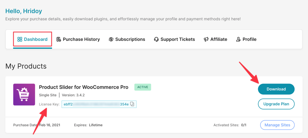 3. You will find the Download option and the plugin License Key here.