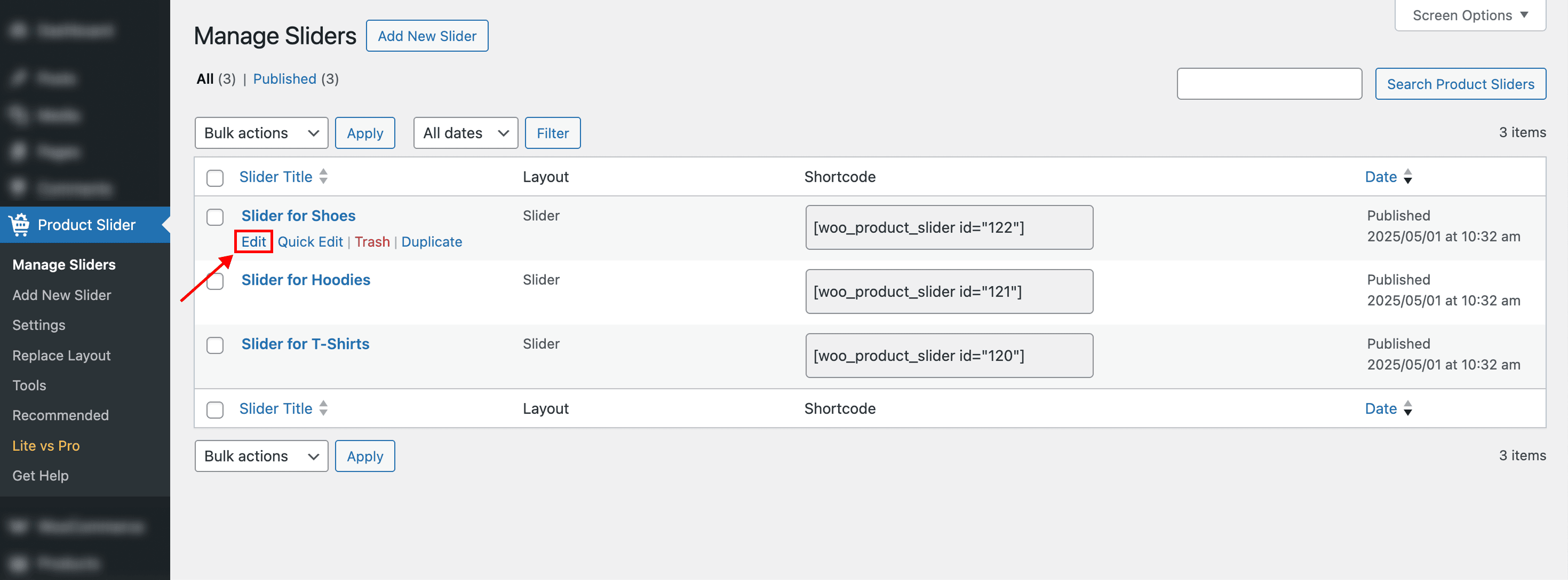 Edit A Product Slider Go to Product Slider → Manage Sliders. Find out the Slider Shortcode that you want to edit. Click on the Edit option. Customize the settings fields. At last, click on the Update button. Reload the page or post where it is used. Doc navigation← Add New Product SliderDelete A Product Slider →