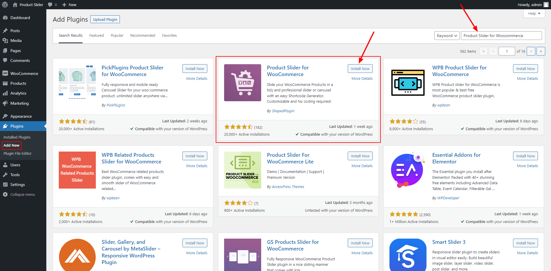 • In the search field type Product Slider for WooCommerce or Product Slider for WooCommerce by ShapedPlugin.